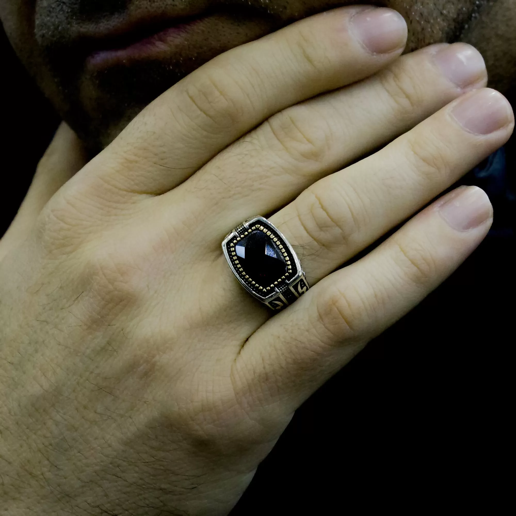 925 Sterling Silver Greek Key Pattern Rings for Men, Greek Key Ring, Silver Onyx Ring, Vintage Jewelry, Man Gemstone Ring, Gift For Men