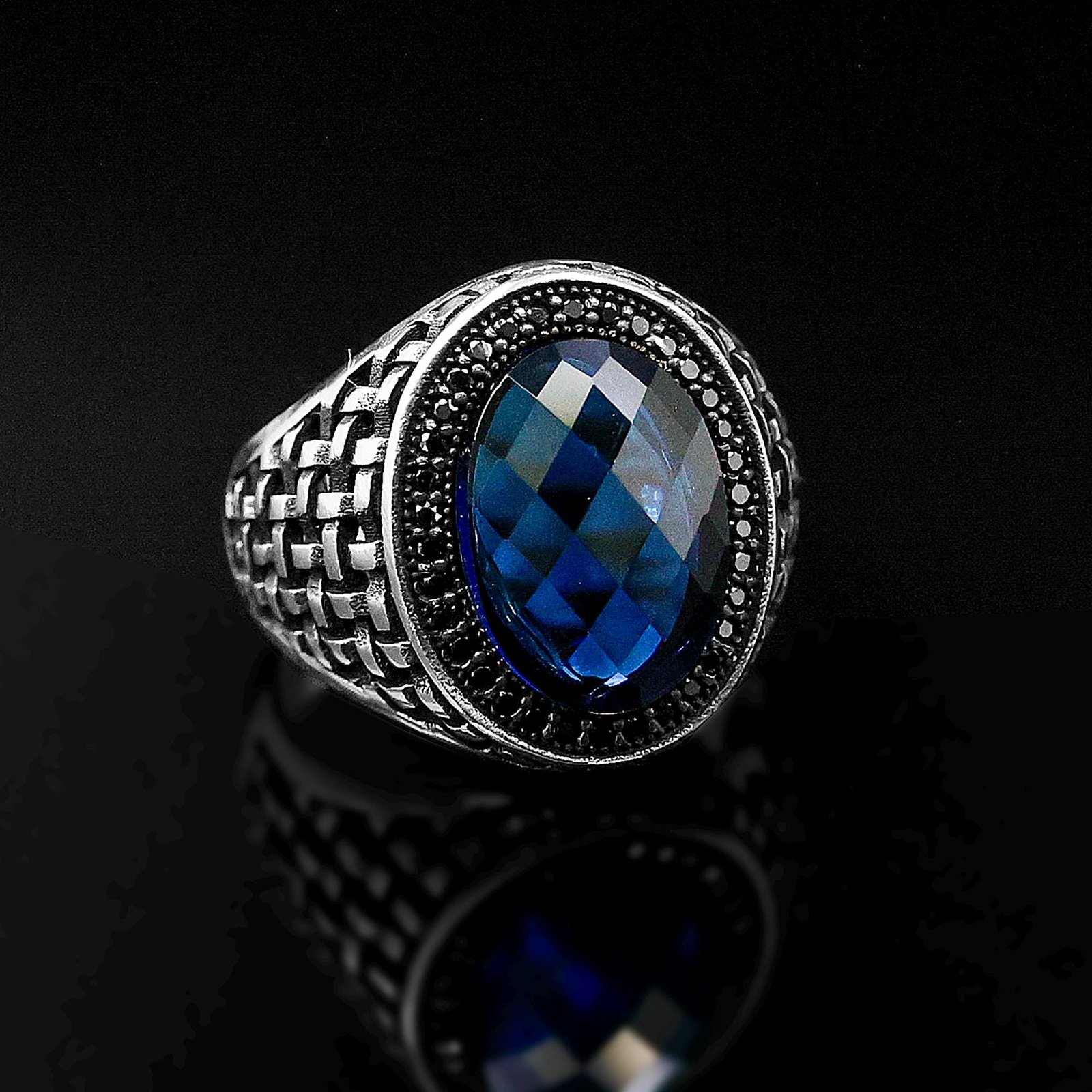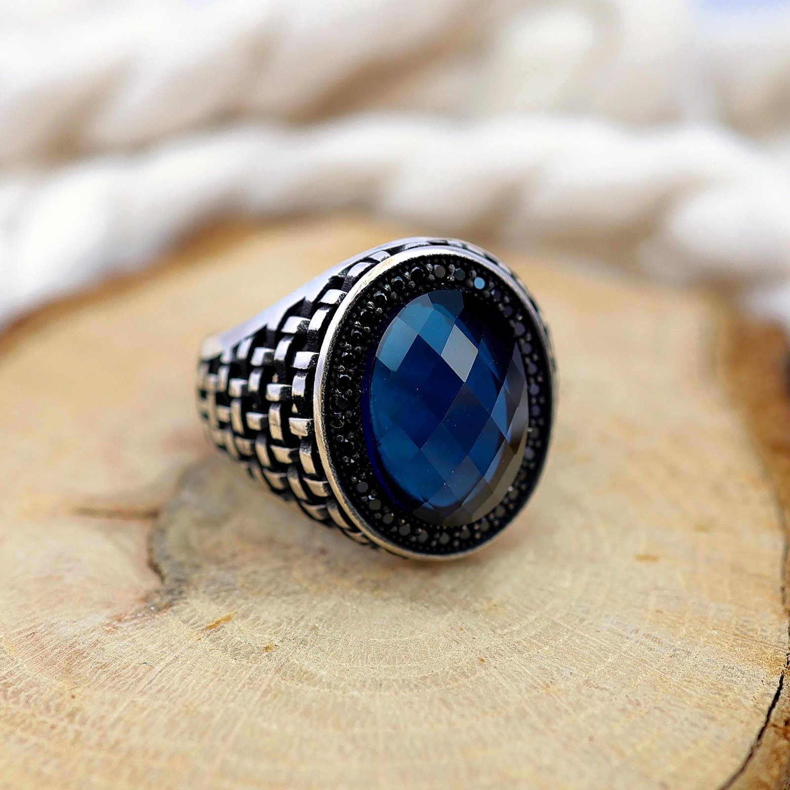 Blue Sapphire Ring for Men: Black Zircon Sterling Silver Statement