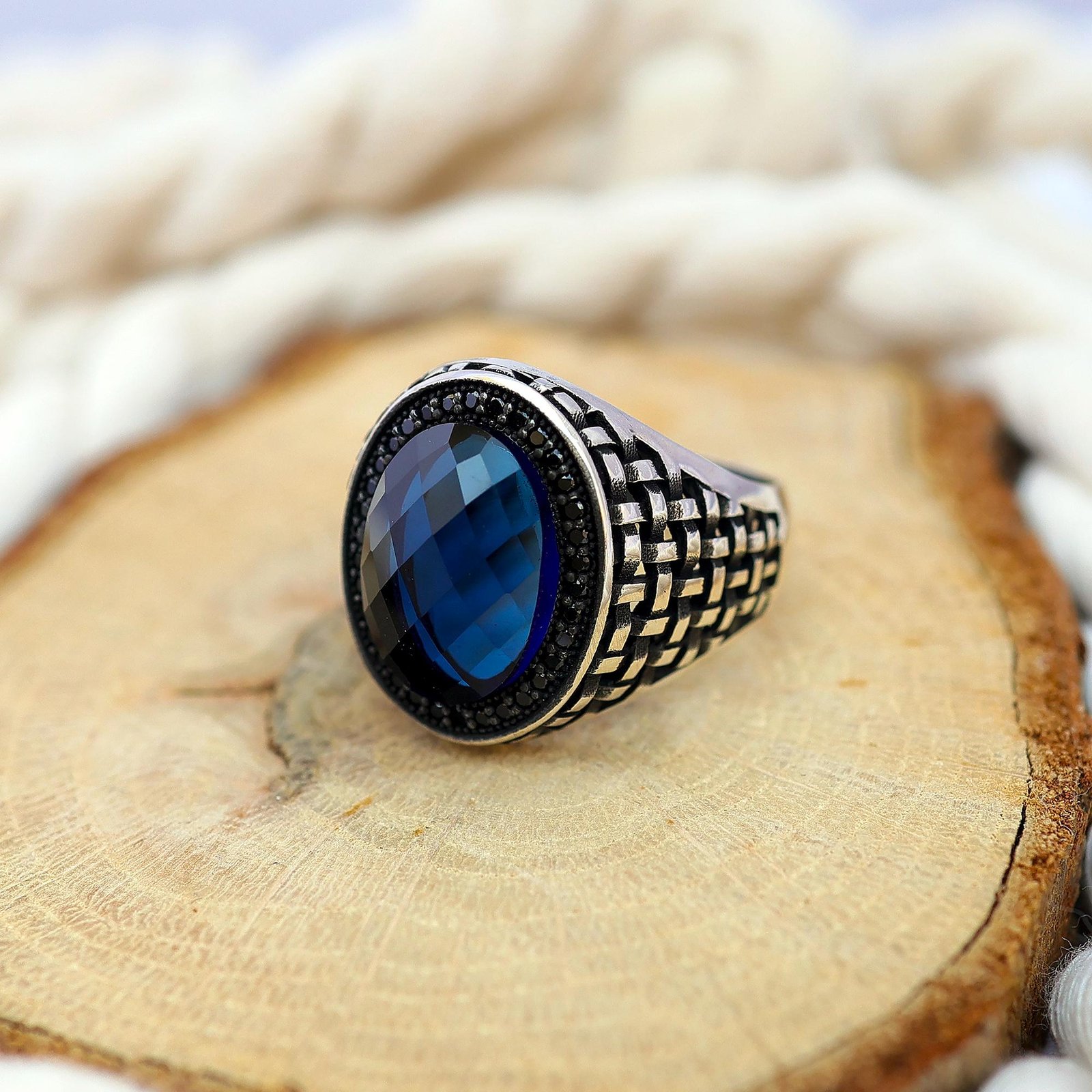 Blue Sapphire Ring for Men – Oval Sapphire Gemstone with Black Zircon Accents, Statement Ring, Royal Style Gift for Him, Bold Men’s Luxury Jewelry