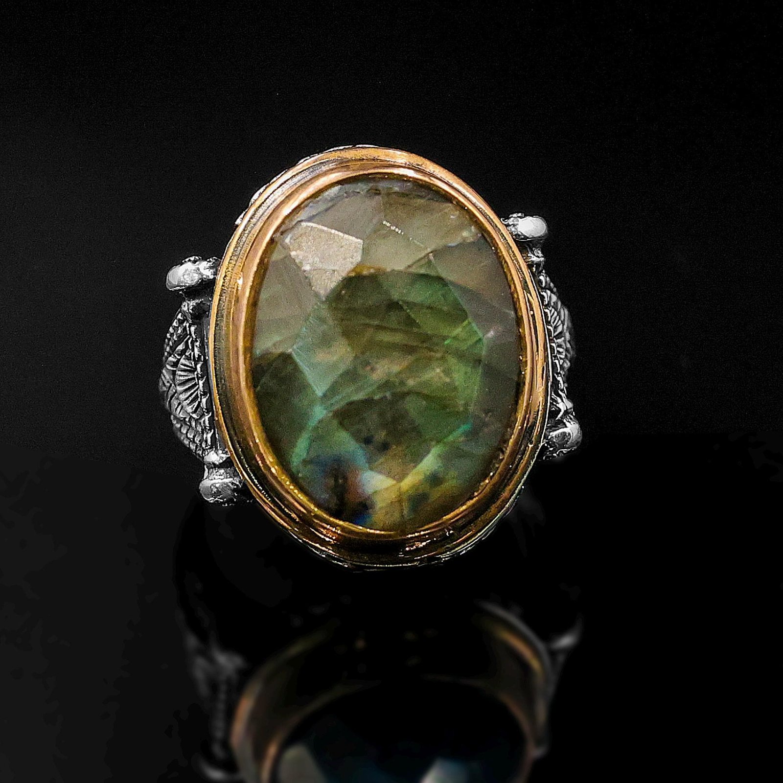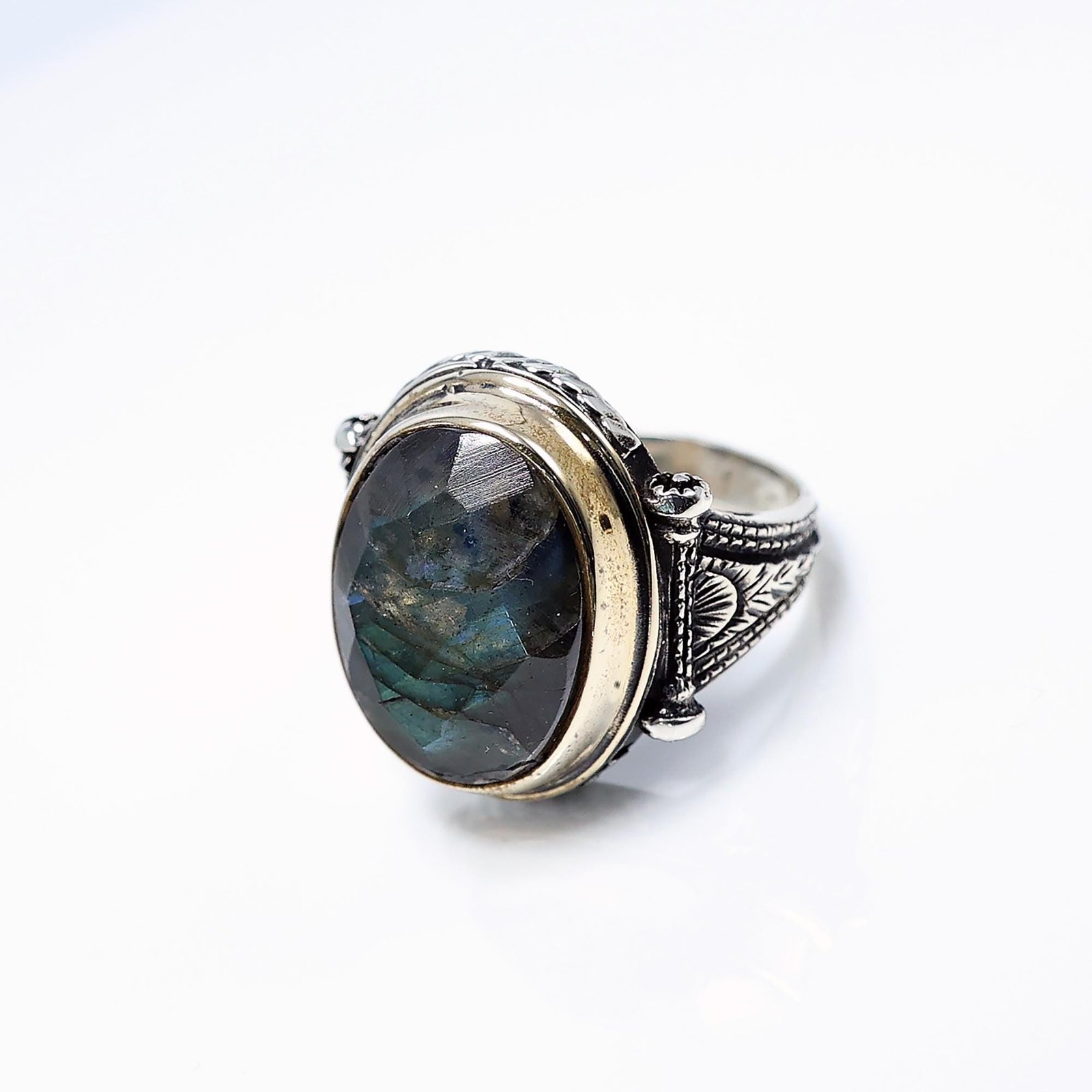 Channel mystical energy and rugged elegance with this handcrafted Labradorite ring, featuring a faceted oval labradorite gemstone set in an intricately dsterling silver band. Each labradorite glows with natural flashes of blue, green, and gold – like a storm captured in stone.