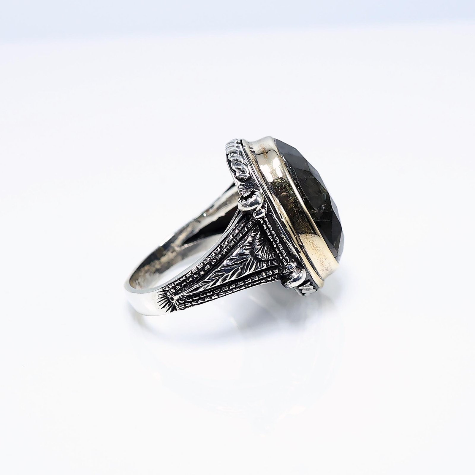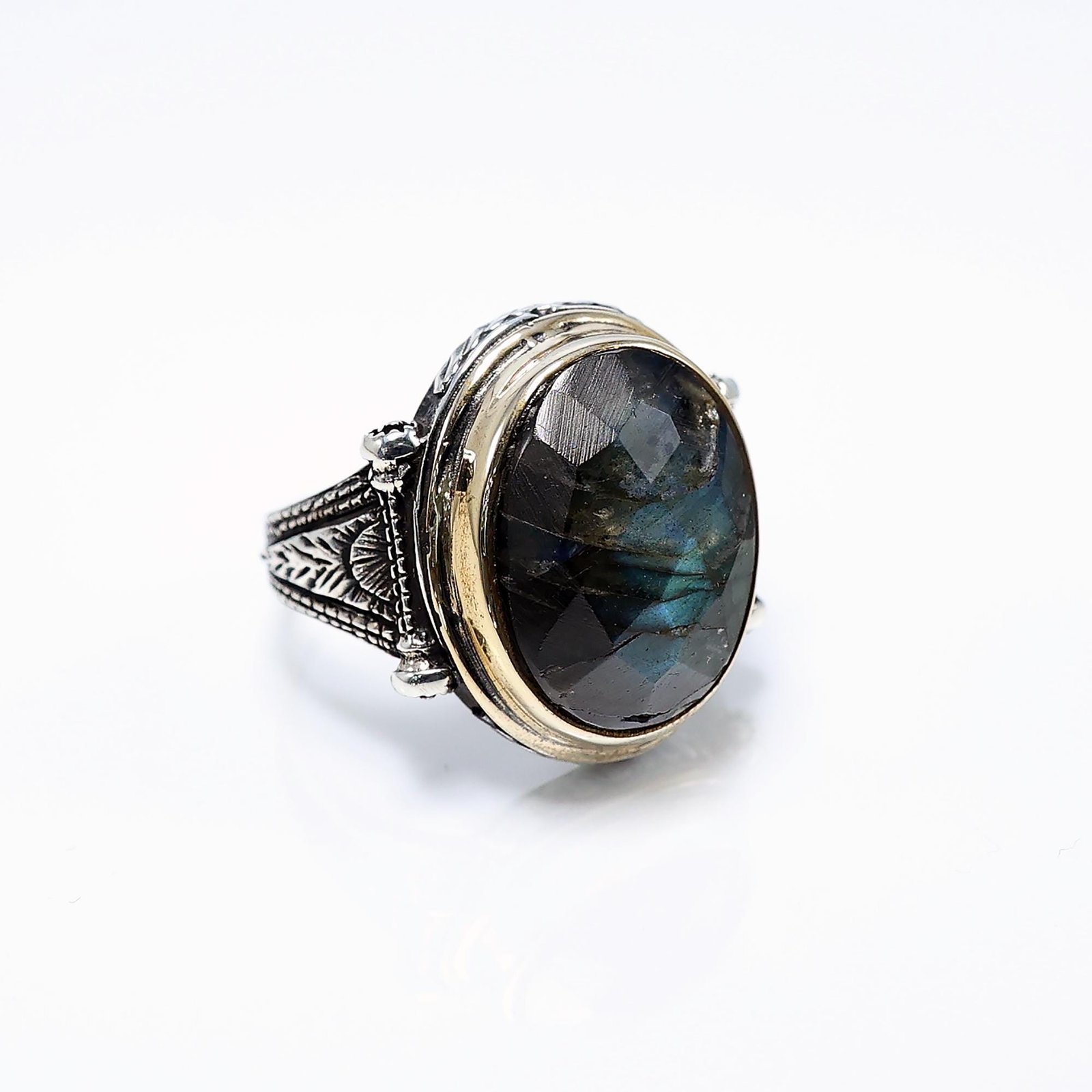 Labradorite Ring for Men – Faceted Oval Gemstone in Ornate Sterling Silver Band, Handmade Boho Statement Ring, Spiritual Crystal Jewelry, Gift for Him