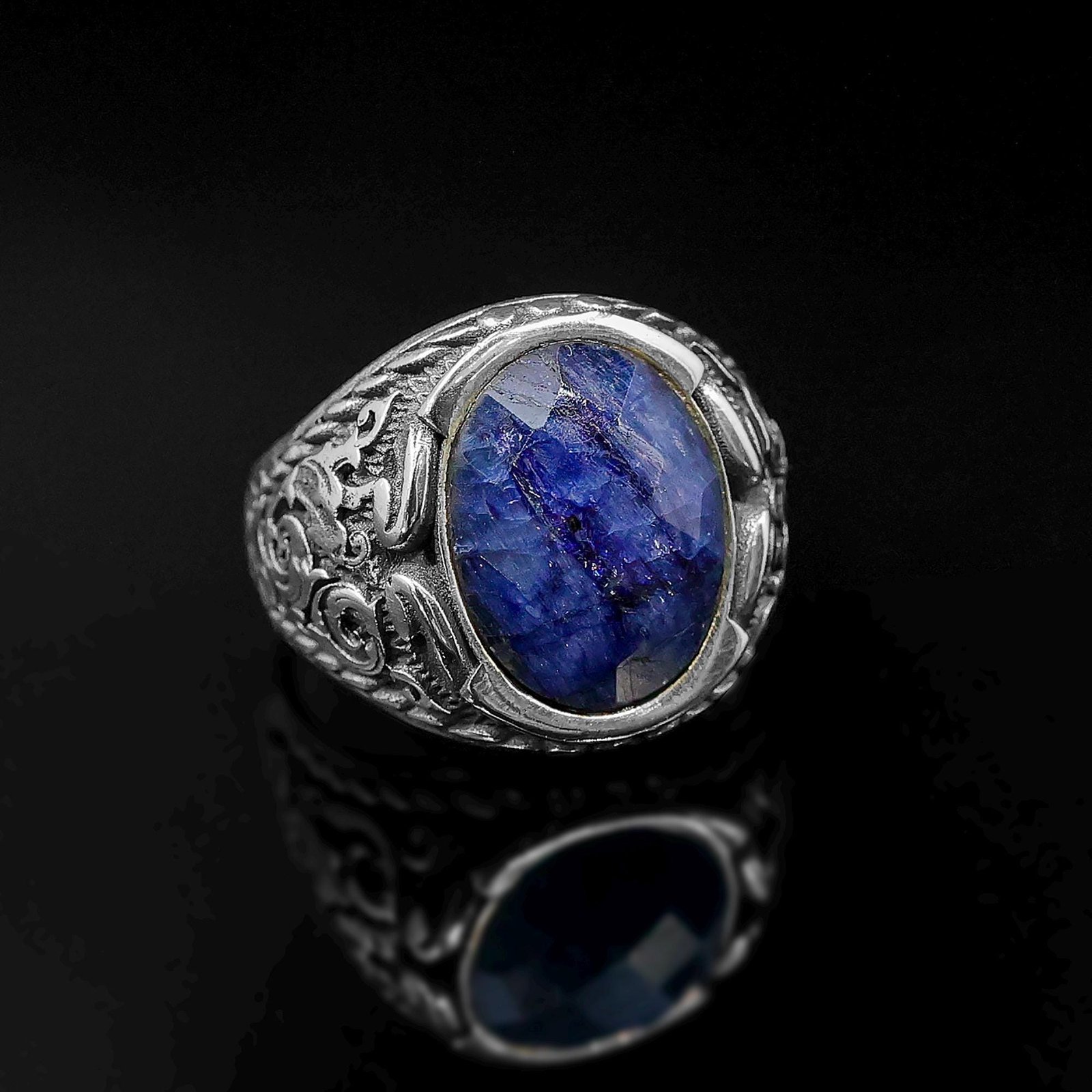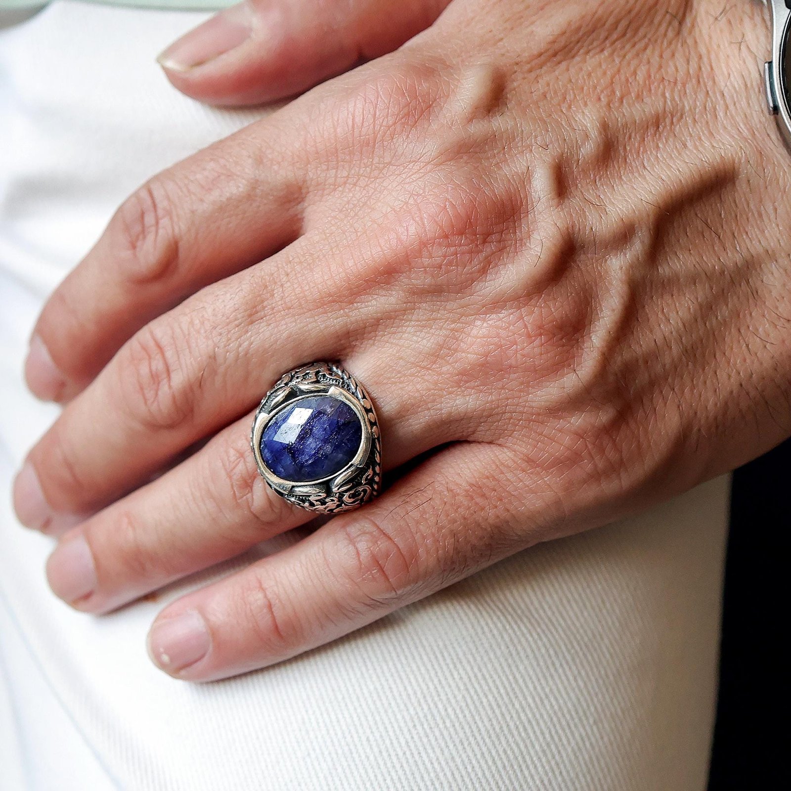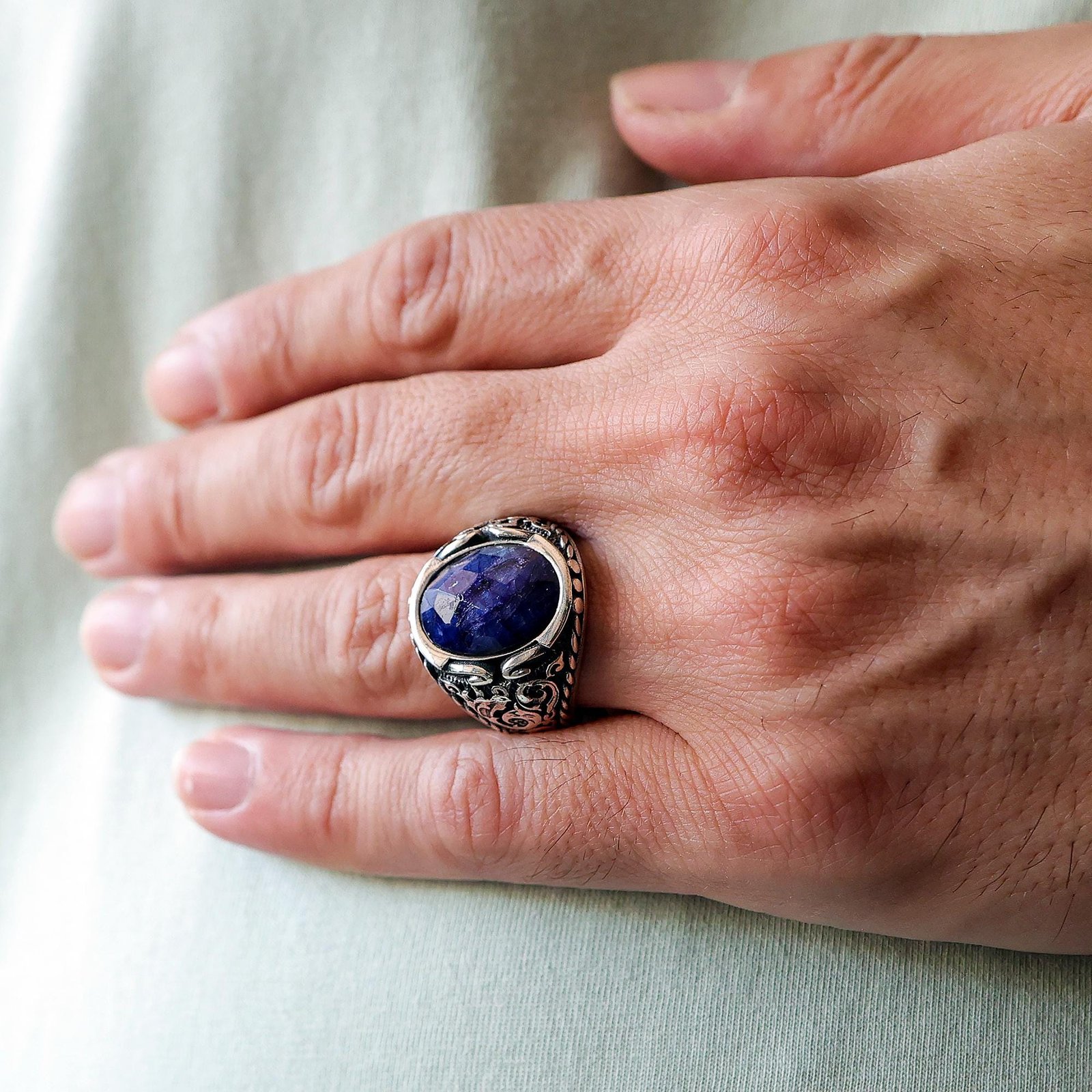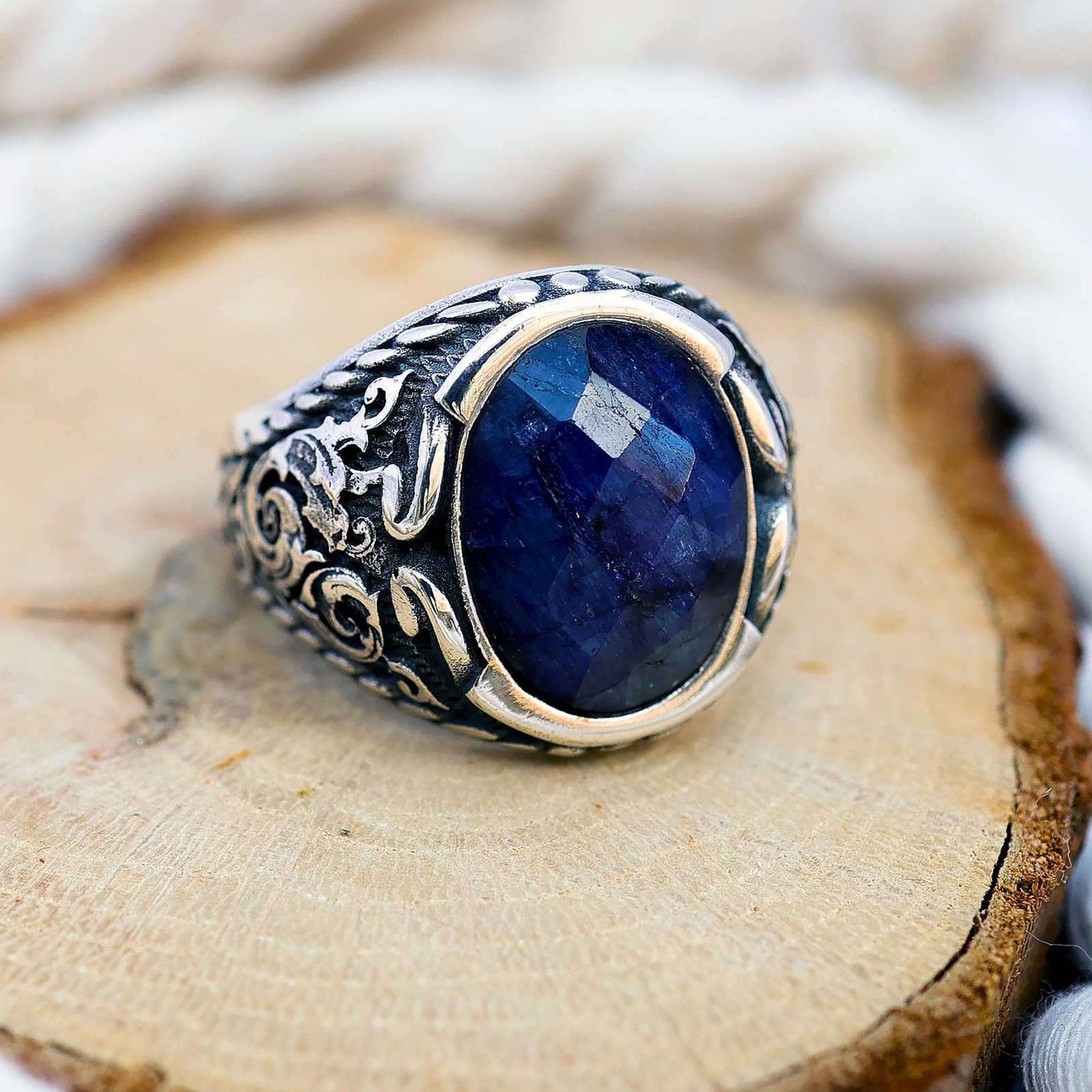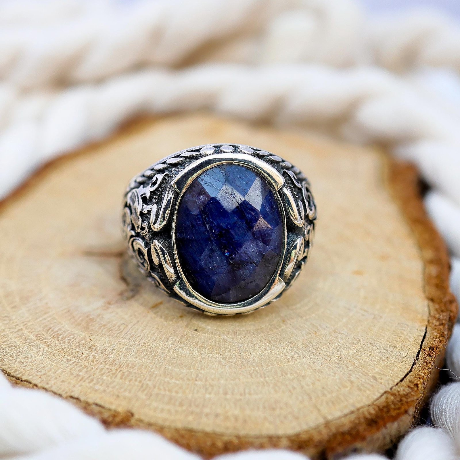 Natural Facet-Cut Sapphire Ring for Men – Genuine Blue Sapphire Gemstone, Handmade Sterling Silver Statement Ring, September Birthstone, Gift for Him