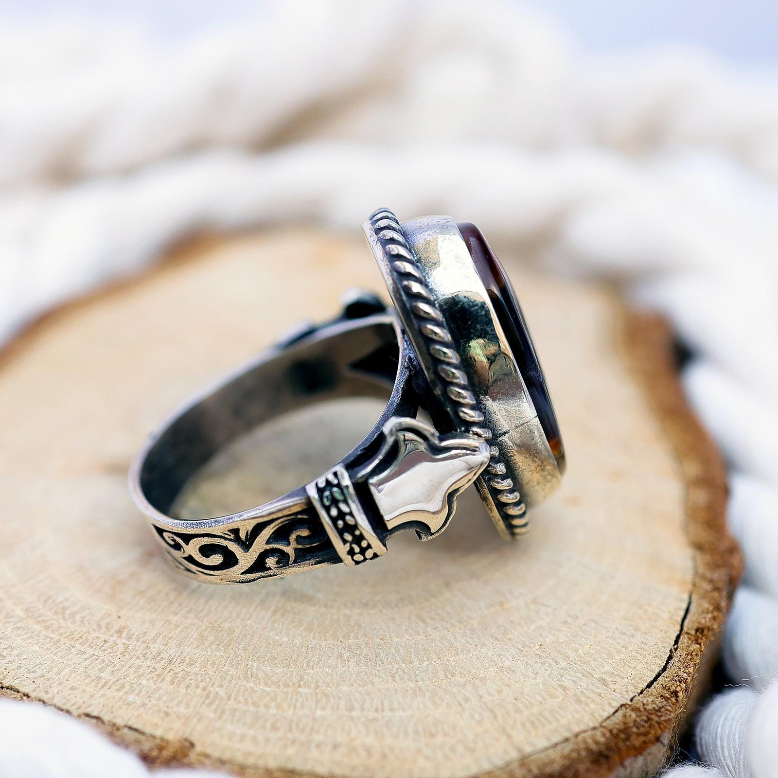Yemeni Agate Ring for Men – Natural Red Aqeeq Stone, Handmade Silver Spiritual Statement Jewelry, Protection Ring, Gift for Him