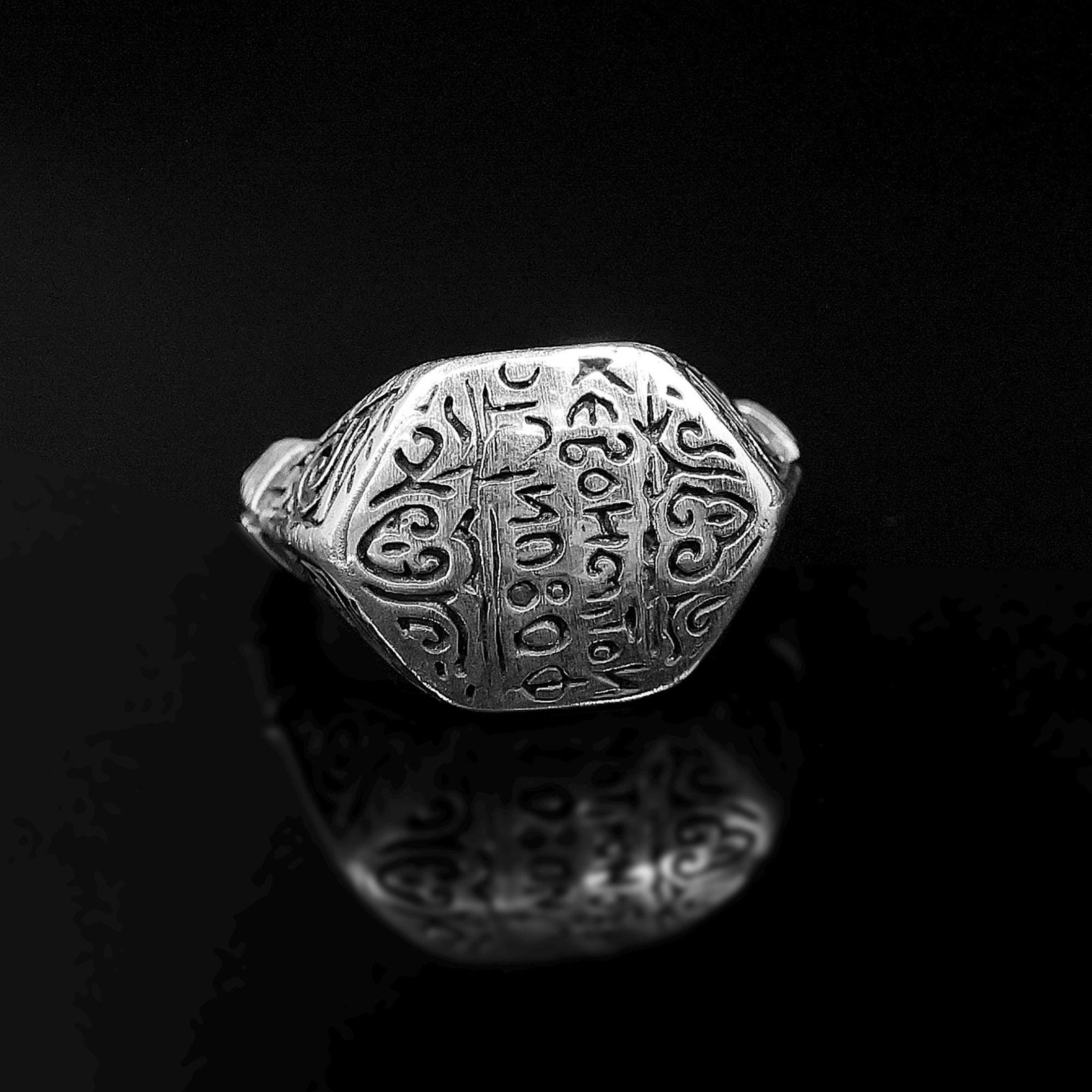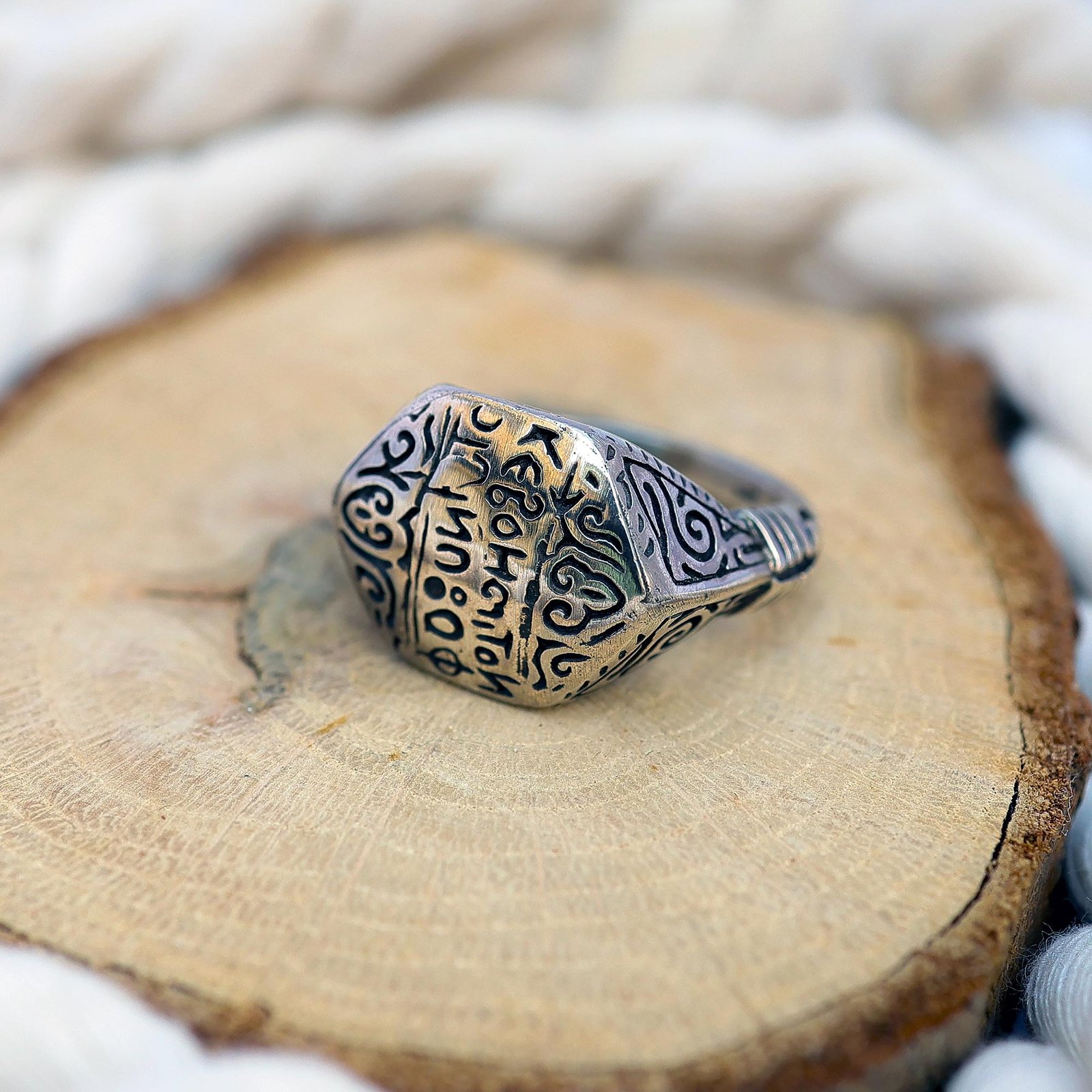 🏛️ This silver ring has ancient Greek characters, and the hexagonal ring surface is decorated with spirals and leaves surrounding both sides of the ring, and also bears ancient Egyptian traces. The ancient Greek characters on the ring mean “May God bless the one who wears it”. It makes the wearer feel Peace, its shape is simple but mysterious, and its design is unique.