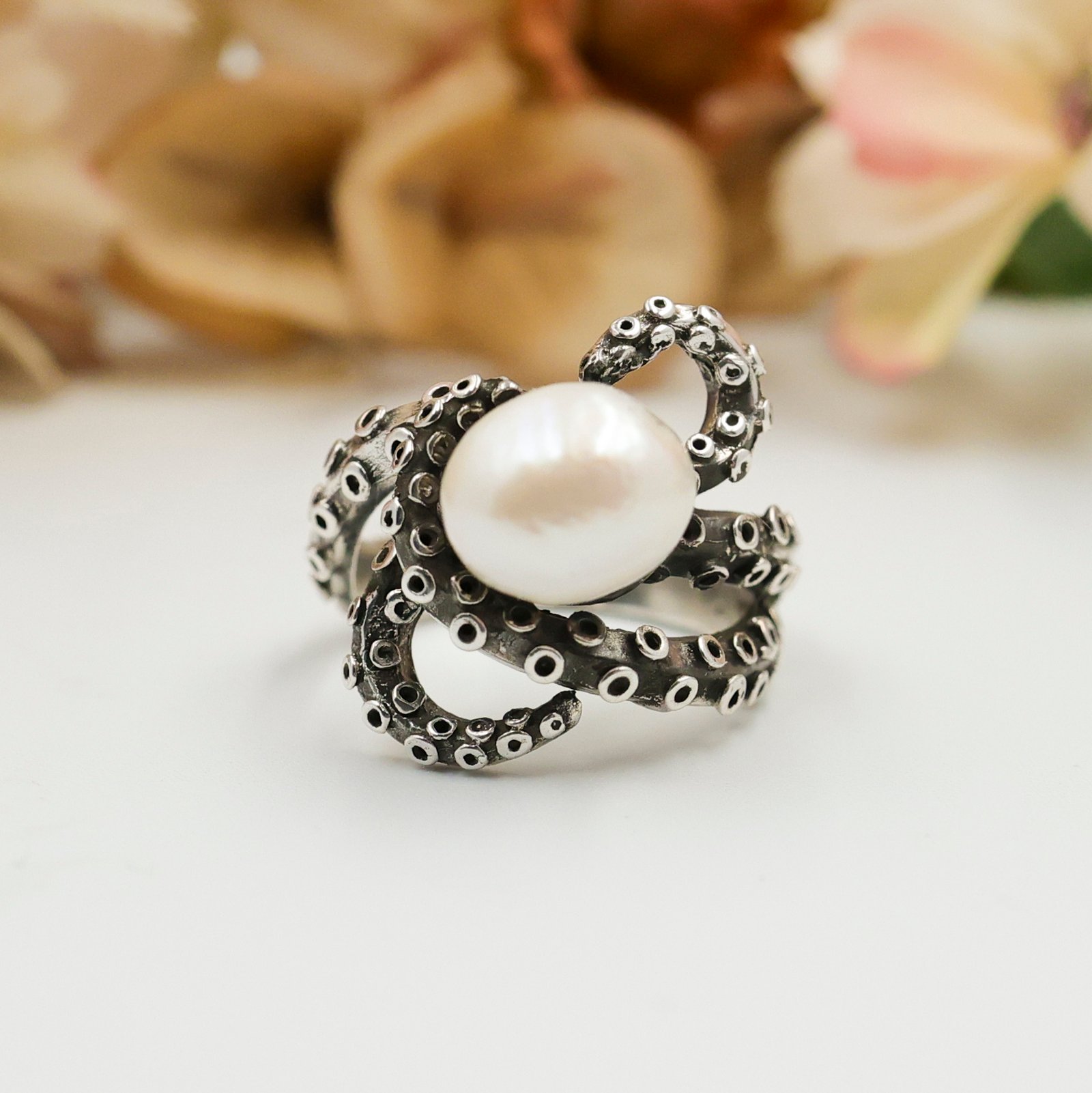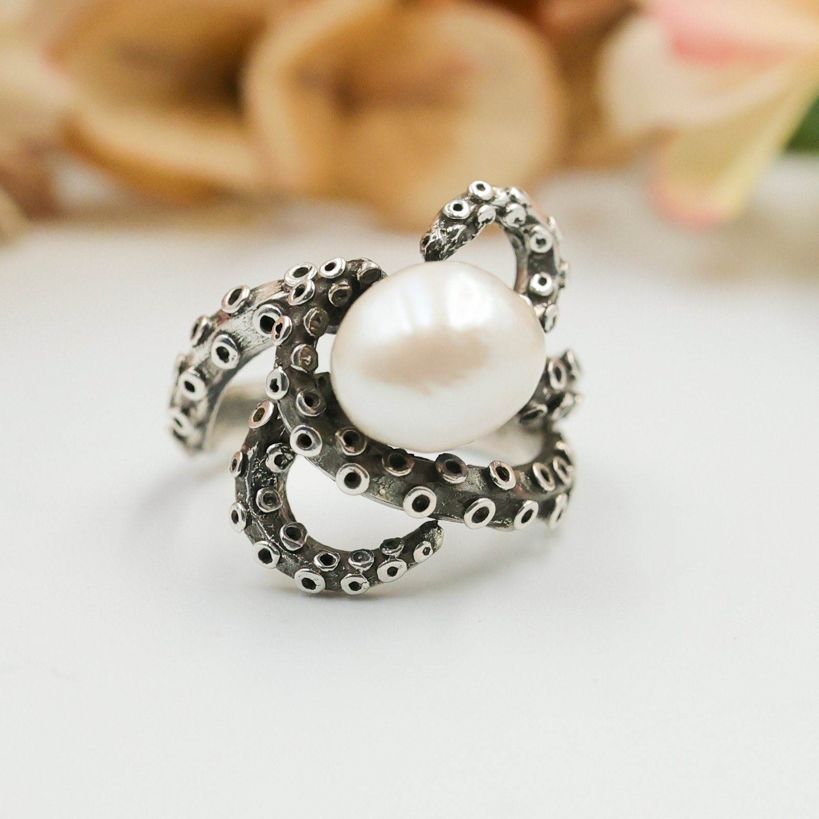 Stunning Octopus Pearl Ring 925 Sterling Silver – Nautical Handmade Statement Ring, Unique Ocean Jewelry Gift for Women