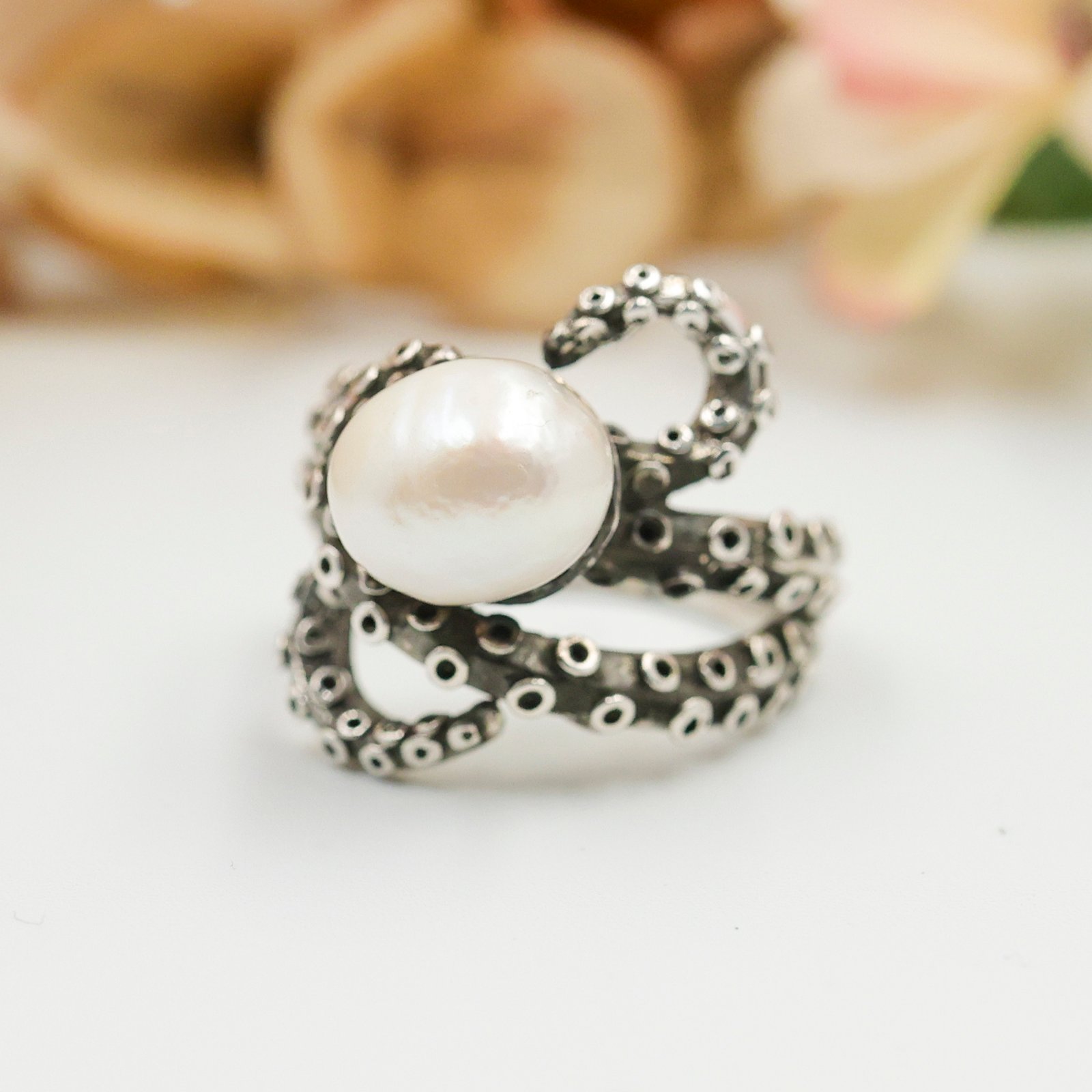 Octopus pearl ring in 925 sterling silver. Handmade nautical statement ring with unique design and elegant pearl detail.