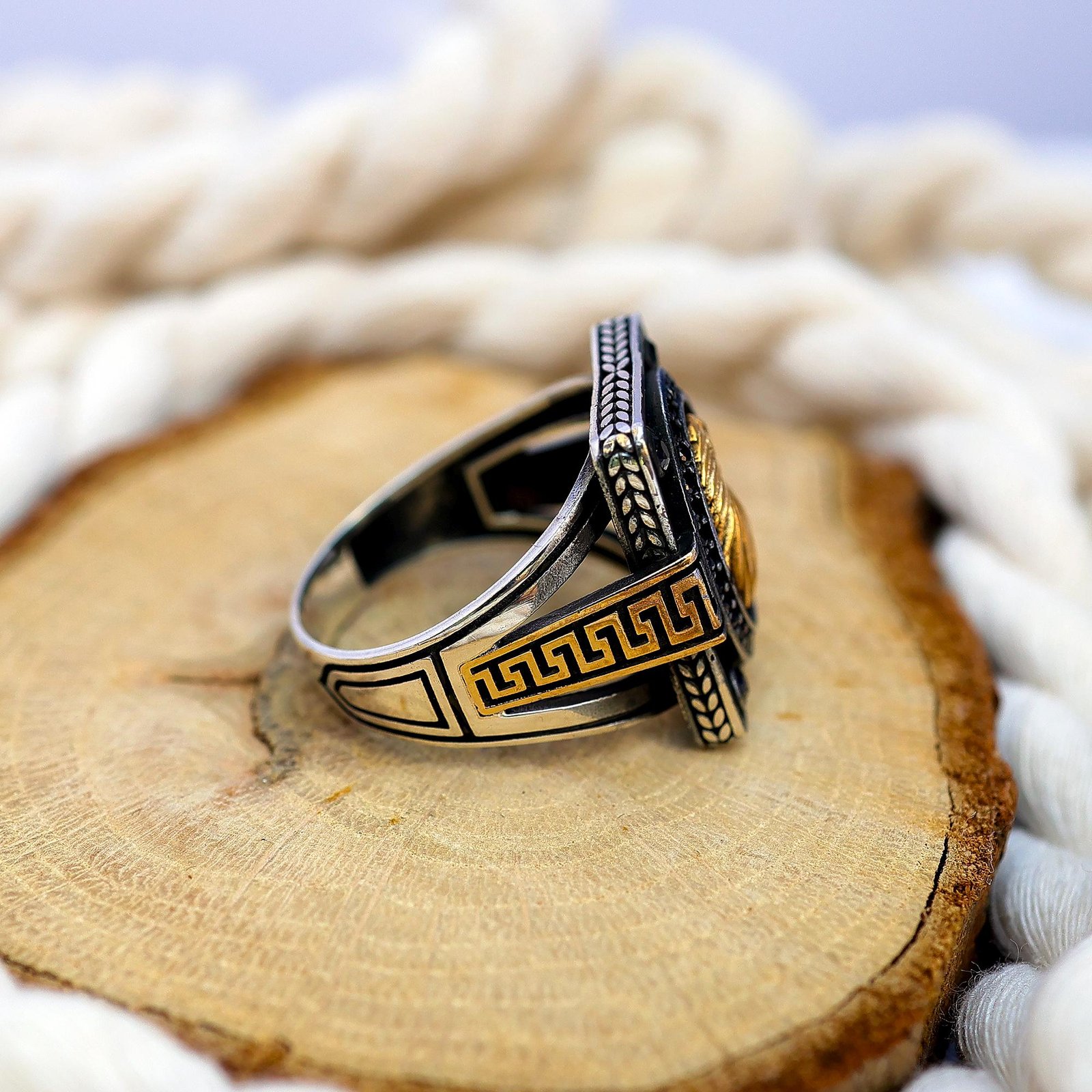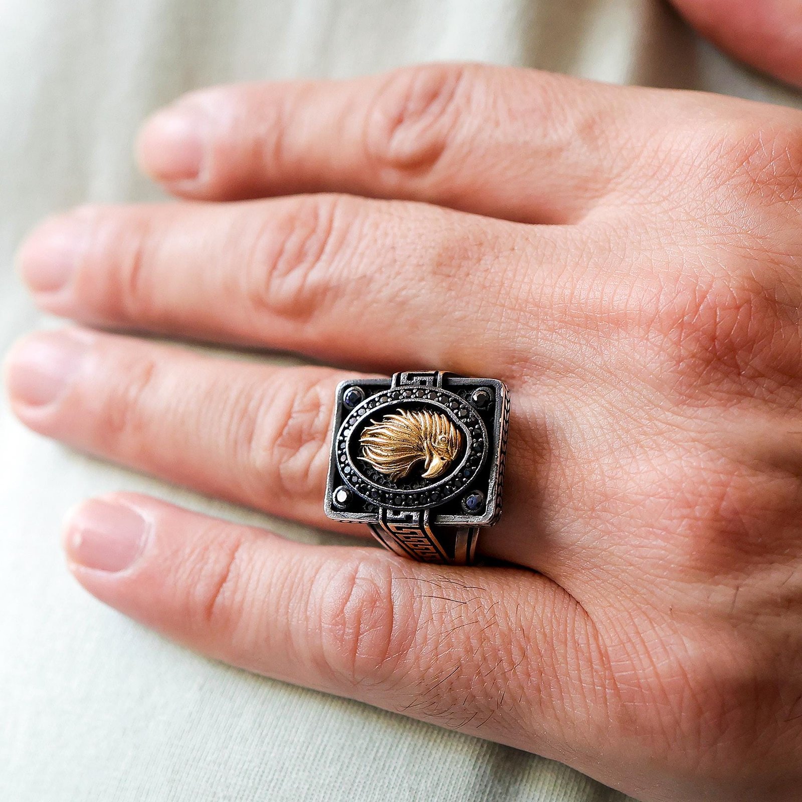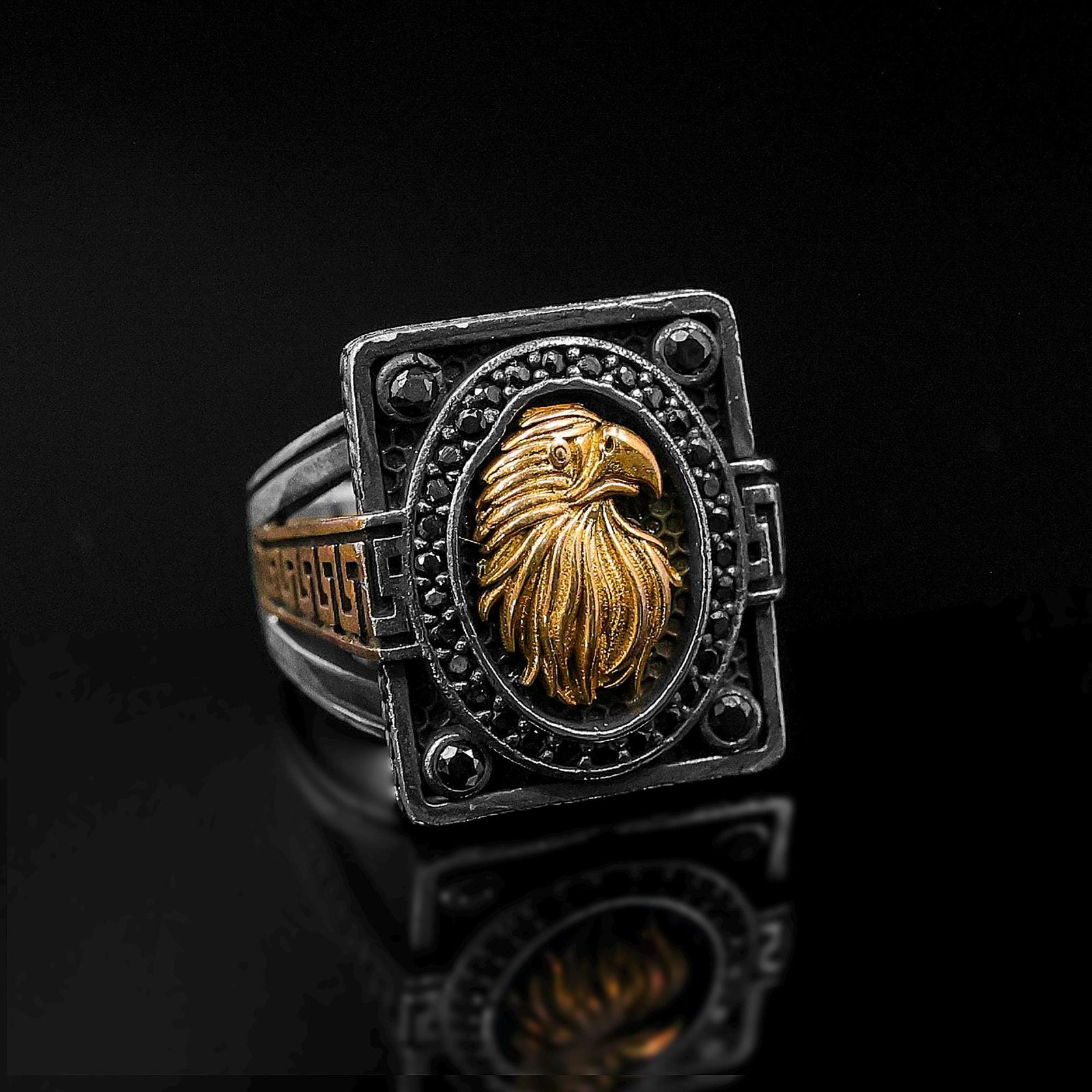 Stand out with this fierce and refined Eagle Head Ring, crafted for men who lead with strength and vision. The golden eagle head rises from a deep black background framed in a bold rectangular face and detailed with warrior-style embellishments.