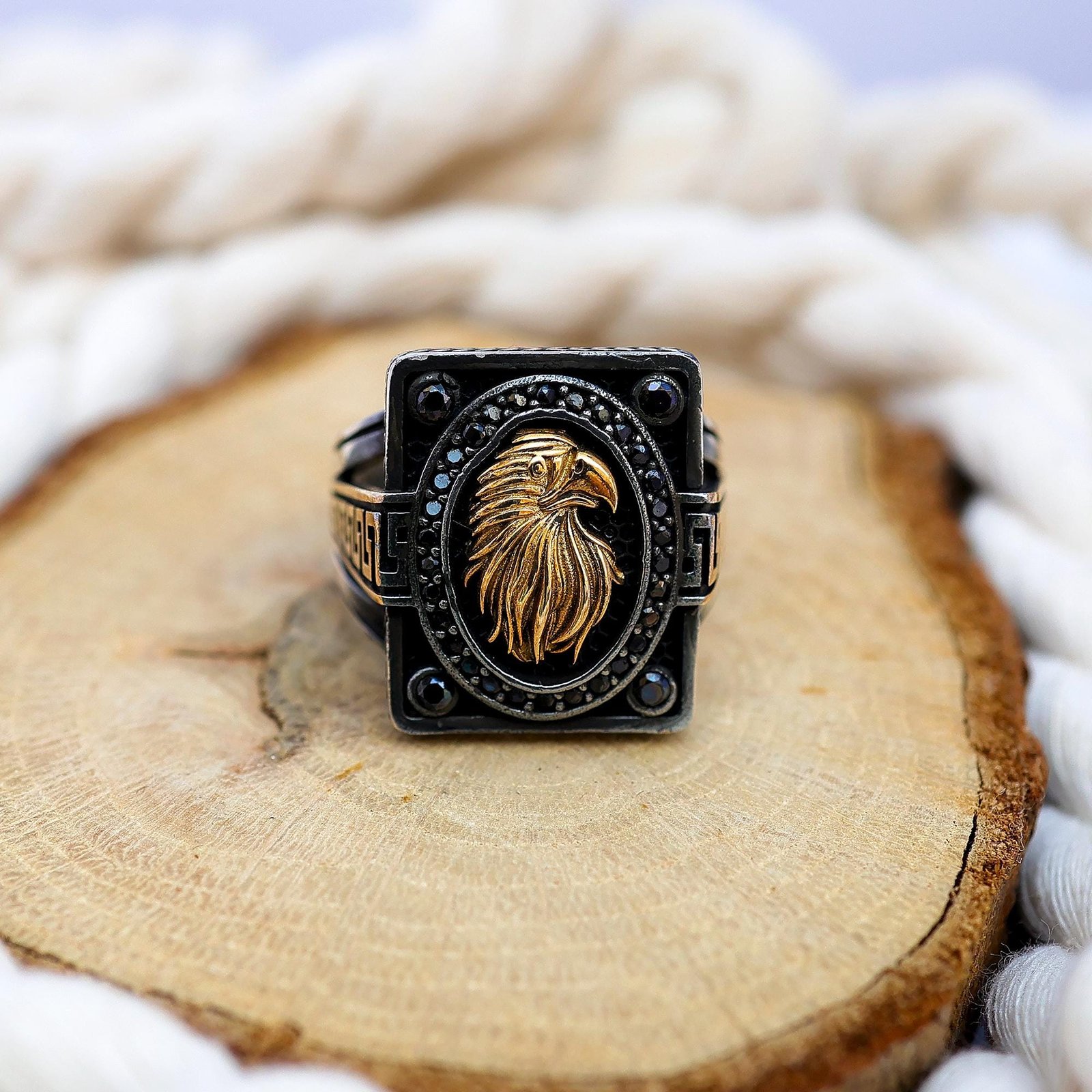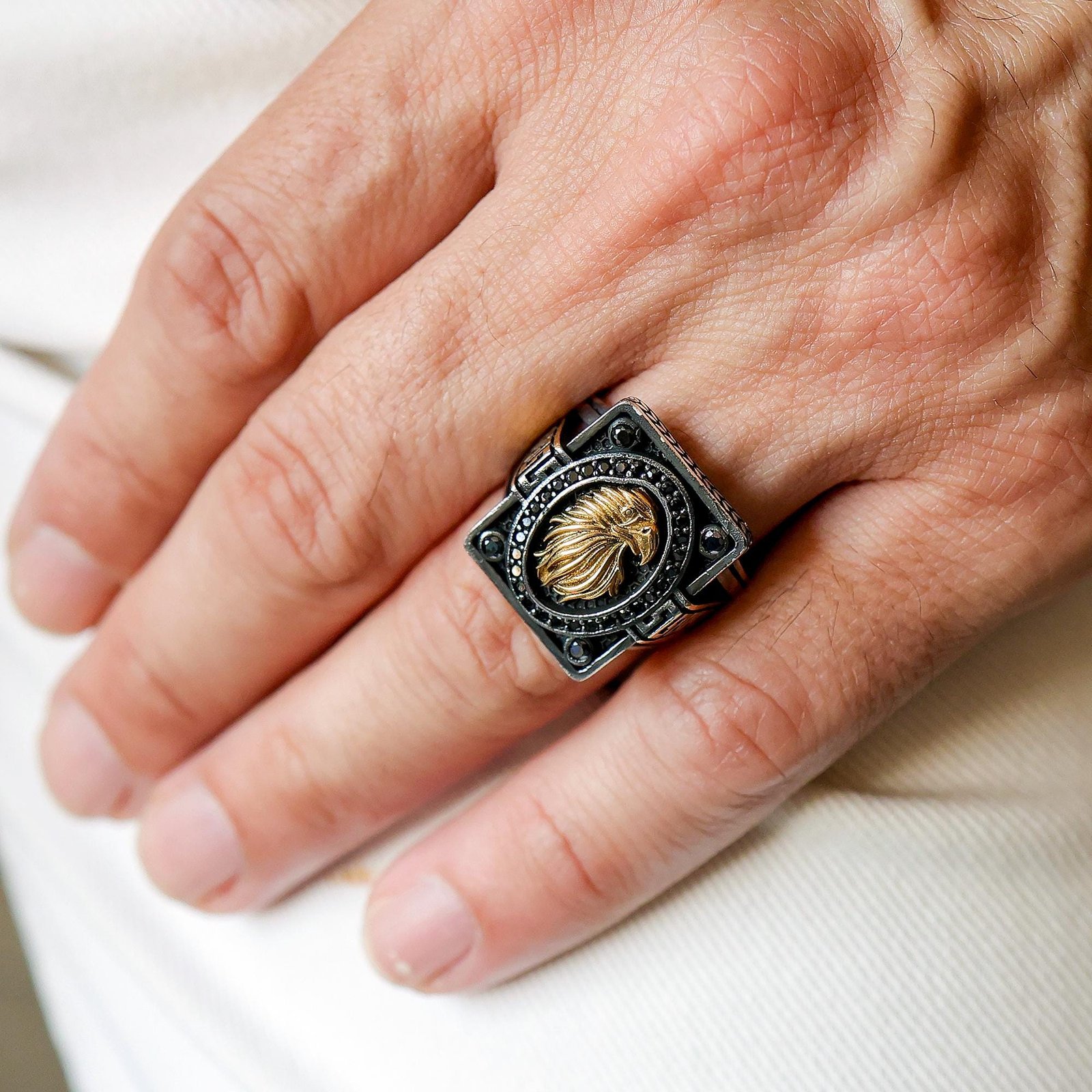 Eagle Head Ring for Men – Bold Rectangular Gold Eagle Ring, Black Antiqued Statement Band, Warrior Biker Jewelry, Gift for Him, Alpha Animal Ring